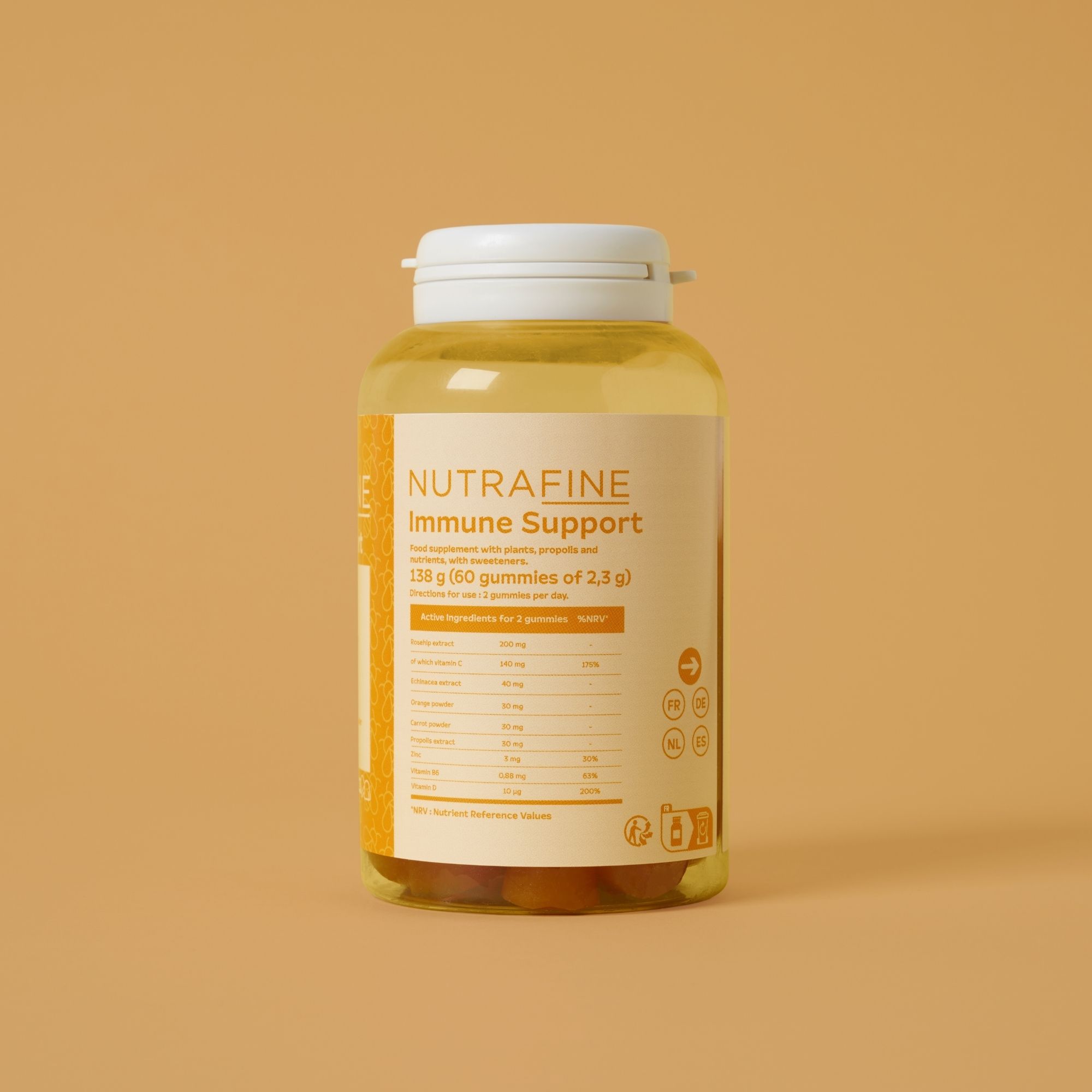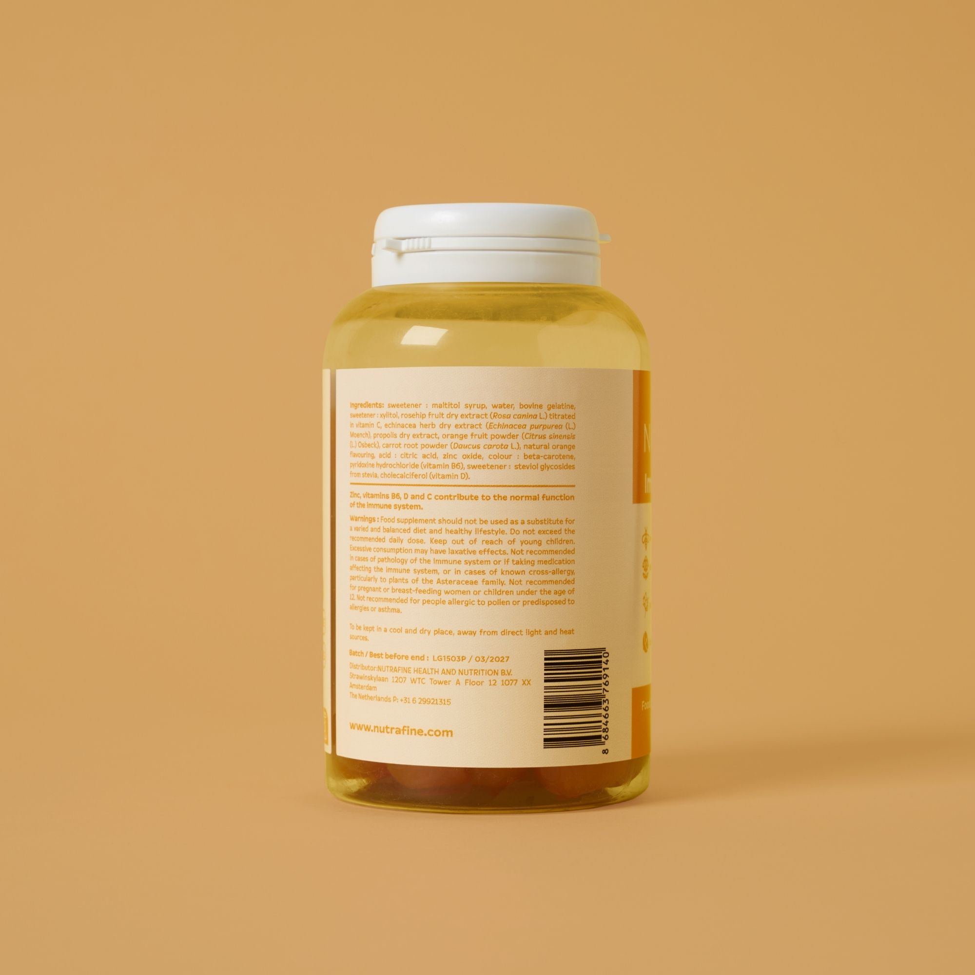 Süßungsmittel: Maltit-Sirup, Wasser, Rinder-Gelatine, Süßungsmittel: Xylitol, getrockneter Hagebuttenextrakt (Rosa canina L.) mit standardisiertem Vitamin C-Gehalt, getrockneter Echinacea-Kraut-Extrakt (Echinacea purpurea (L.) Moench), getrockneter Propolis-Extrakt, Orangensaftpulver (Citrus sinensis (L.) Osbeck), Karottenwurzelpulver (Daucus carota L.), natürliches Orangenaroma, Säuerungsmittel: Zitronensäure, Zinkoxid, Farbstoff: Beta-Carotin, Pyridoxinhydrochlorid (Vitamin B6), Süßungsmittel: Steviolglycoside aus Stevia, Cholecalciferol (Vitamin D).