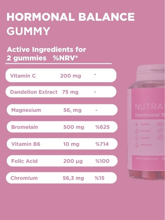 Sweetener : maltitol syrup, water, bovine gelatine, L-ascorbic acid (vitamin C), dandelion root uid extract (Taraxacum ocinale (L.) Weber ex F.H.Wigg.), magnesium salts of citric acid, bromelain, avouring, acid : citric acid, colour : lycopene, sweetener : steviol glycosides from stevia, pyridoxine hydrochloride (vitamin B6), pteroylmonoglutamic acid (folic acid), chromium picolinate.