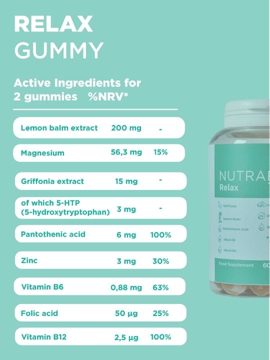 Sweetener : maltitol syrup, water, bovine gelatine, lemon balm leaf uid extract (Melissa officinalis L.), magnesium salts of citric acid, griffonia seed dry exract (Griffonia simplicifolia (DC.) Baill.) titrated in 5-HTP, avourings, acid : citric acid, calcium D-pantothenate (pantothenic acid), zinc oxide, colour : lycopene, pyridoxine hydrochloride (vitamin B6), sweetener : steviol glycosides from stevia, pteroylmonoglutamic acid (folic acid), methylcobalamin (vitamin B12).